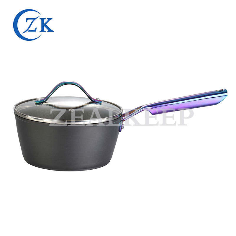 Zealkeep hårdanodiserad smidd aluminium Nonstick Köksredskap Set, med livsmedelskvalitet aluminiumlegering också miljövänlig, Fantastisk tre lager non-stick inre beläggning håller hälsan. Den hårdanodiserade interiören och exteriören tål diskmaskin. Klassisk induktionssockel med både eldkok och elspis kokfri. Det mest enastående försäljningsargumentet är PVC-handtag i rostfritt stål med gradientfärg. Det gör att kostymsatsen lyser superstjärna om någon lägger den på bra hyllor eller produktkataloger. Många kunder älskar att visa det som ett bra alternativ när de diskuterar köpplan och lätt att bli plockade ut på marknaden.